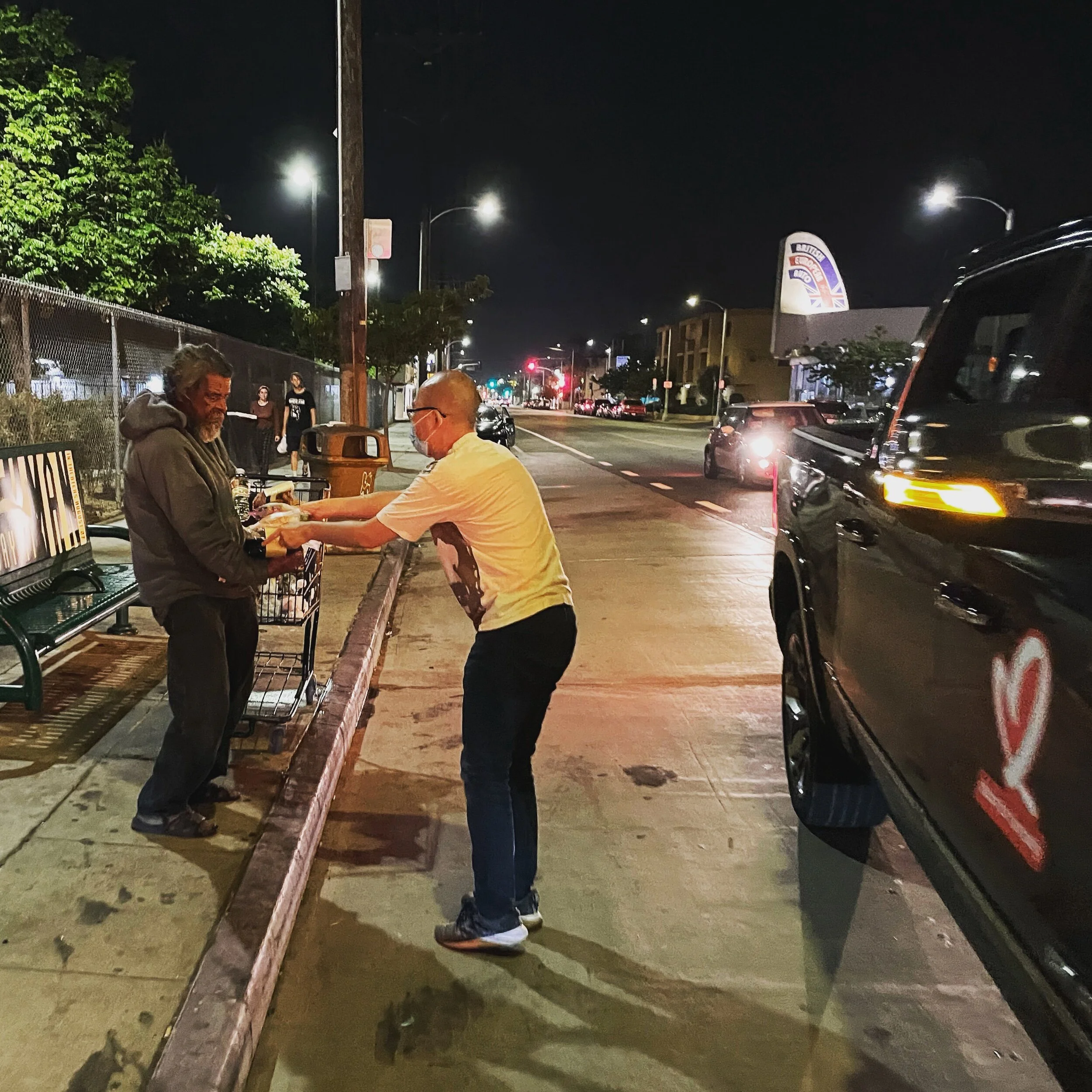 Care Mission volunteer, Joseph Wu, handing out a meal set that includes a sandwich, water, fruit, and cookies.