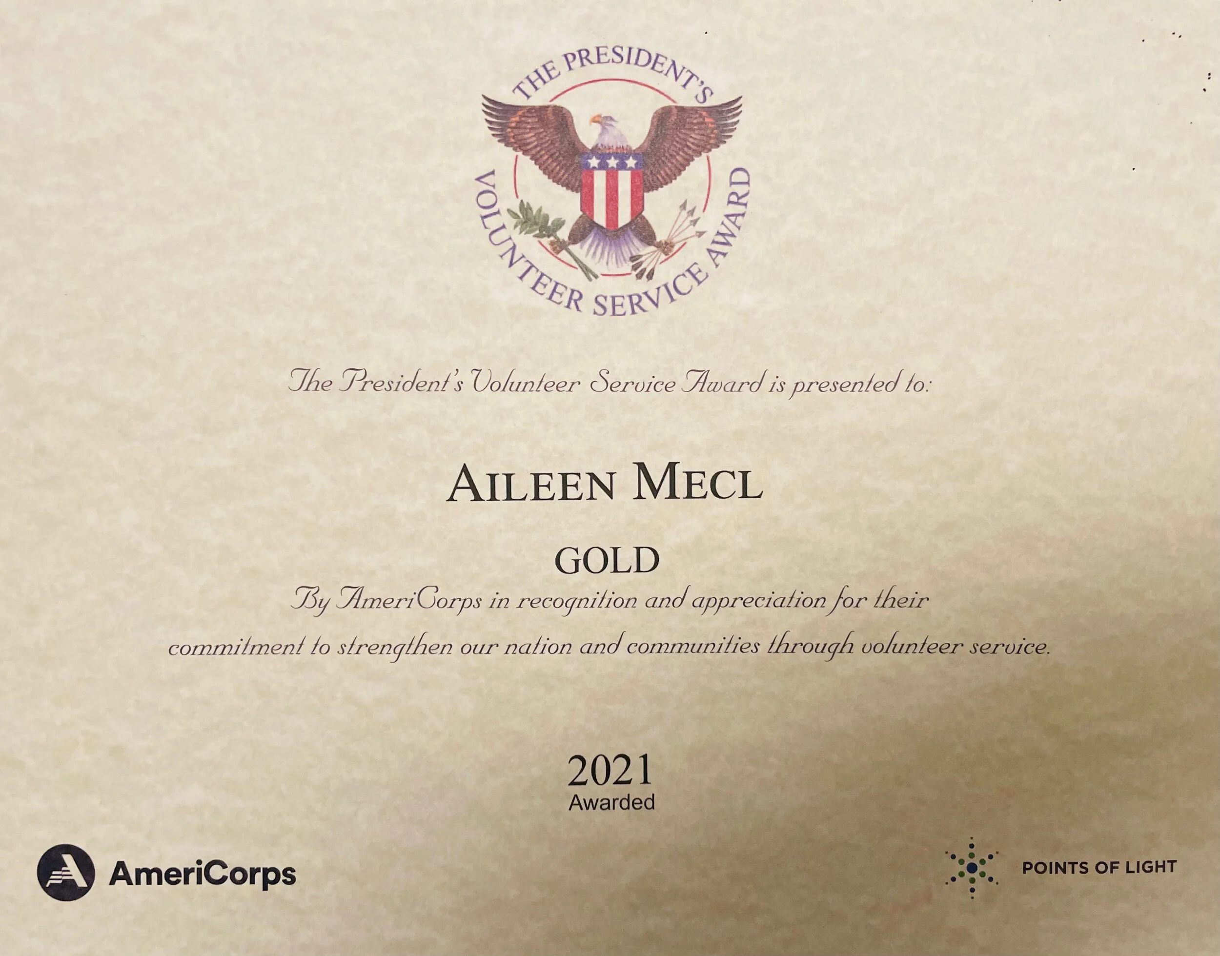 Matthew Mecl (left) and Aileen Mecl (right) receive “The President’s Volunteer Service Award”